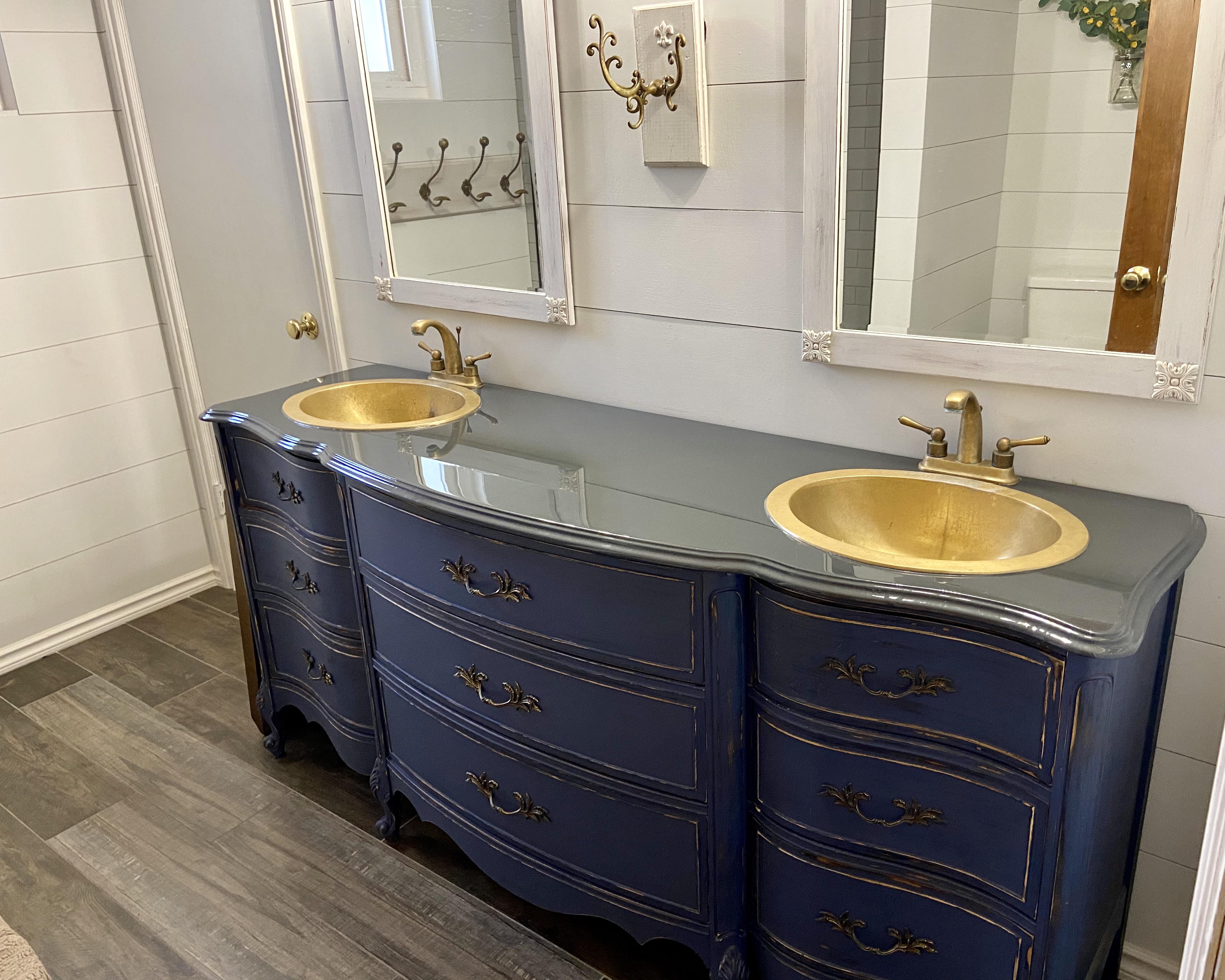 Choose a sink and faucet · step 3: Evaluate the dresser · step 2: Remove the sides and backs of the top two drawers to create false drawer fronts. Double check there are no holes for water to leak through at . Brittney marcum bought this piece as a dresser from a local store for $350 and hired a local. How to repurpose a dresser into a bathroom vanity. Check out our dresser sink vanity selection for the very best in unique or custom, handmade pieces from our bathroom vanities shops. Place sink into the hole, use clear adhesive to put it in place, then seal it with bathroom caulk. Add wood cleats to interior side of false fronts. How to make a vintage dresser into bathroom vanity. Purchase the sink first, fit to the dresser top measurements. Of course in the end it turned out gorgeous, but i could have saved myself a lot of trouble if i'd had a better idea what to expect from the beginning. · remove the legs (if the vanity will be taller than 36 inches once the countertop is added) .